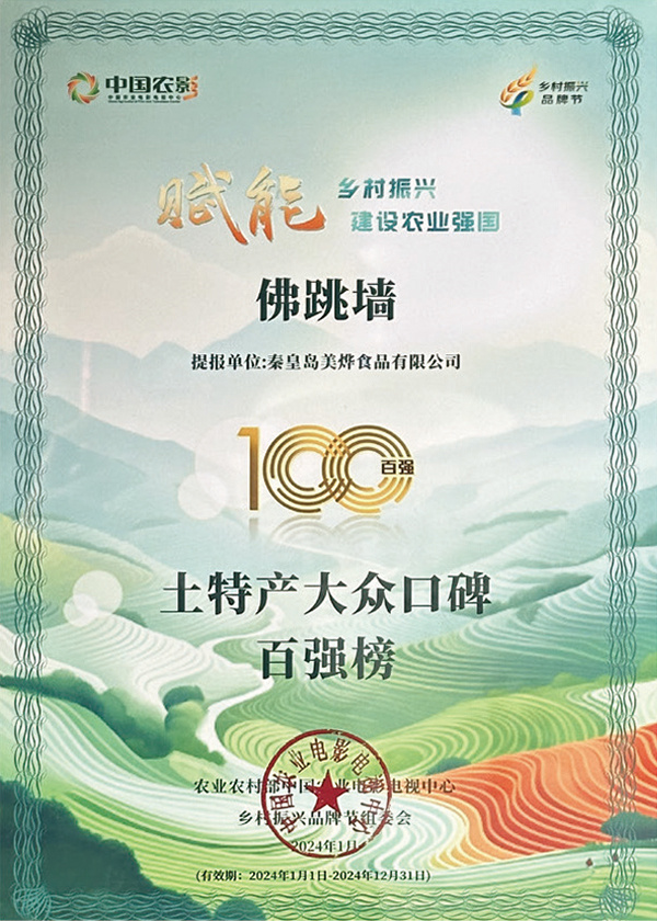 美燁(ye)食(shi)品(pin)佛(fo)(fo)跳墻榮獲(huo)大眾口碑百強榜(bang)由農(nong)(nong)業部直(zhi)屬單(dan)位中(zhong)(zhong)央電視(shi)臺農(nong)(nong)業農(nong)(nong)村頻道(dao)承制單(dan)位中(zhong)(zhong)國農(nong)(nong)影主辦的(de)評比中(zhong)(zhong),美燁(ye)食(shi)品(pin)佛(fo)(fo)跳墻被評為土特產大眾口碑榜(bang)百強。